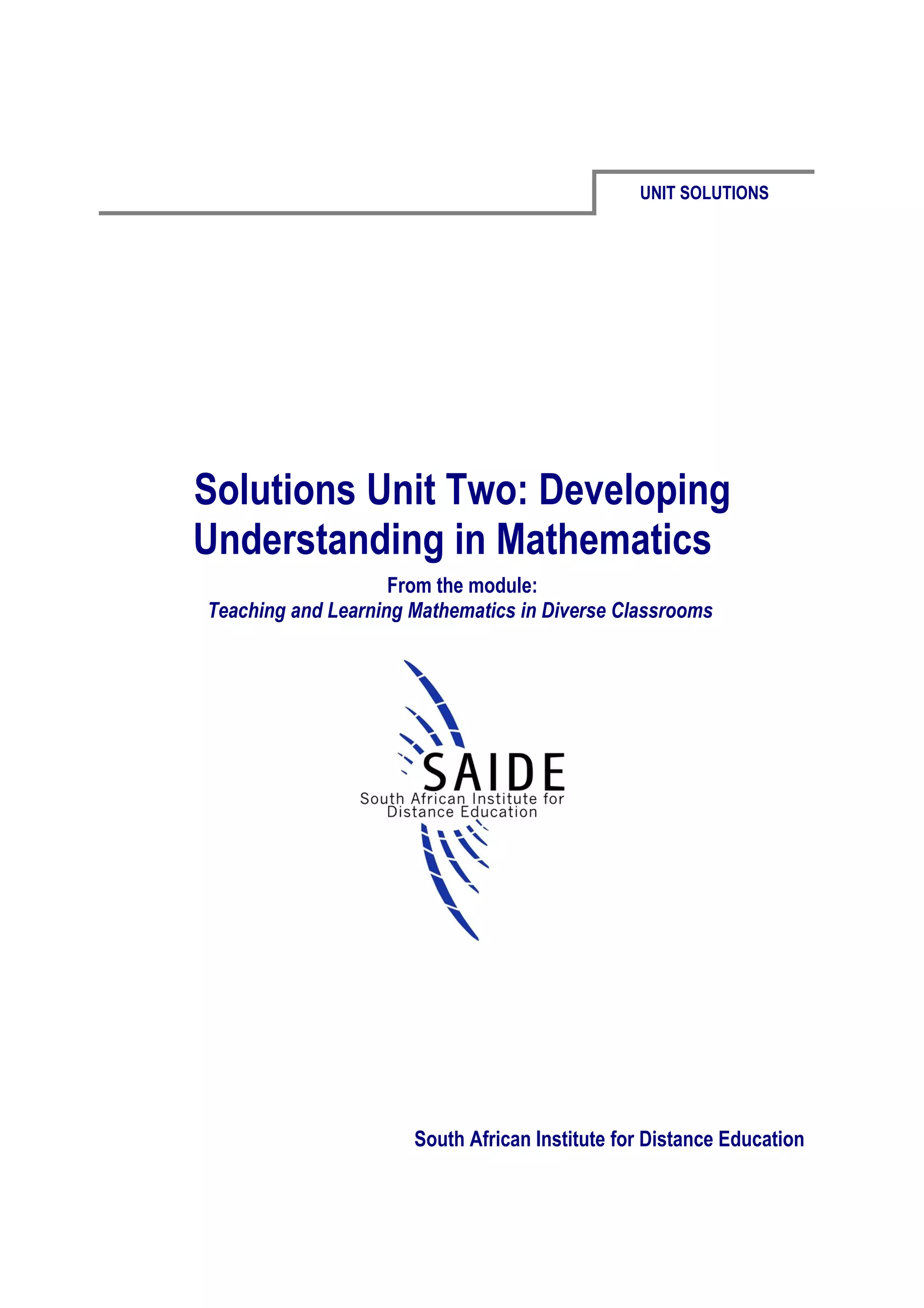 This document serves as a solutions guide for a module focused on understanding mathematics, specifically designed for use in diverse classrooms. It includes activities, structured solutions, and recommendations for teachers to assist learners in developing their mathematical understanding, addressing common misconceptions, and suggesting alternative resources. Key themes include the importance of conceptual understanding over rote procedures, as well as strategies for fostering cognitive connections between mathematical ideas.
