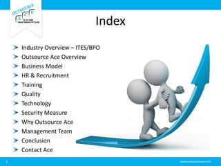 Outsource Ace is a leading contact center providing customer service and other business process outsourcing solutions. It was founded in 2009 in Bangalore, India and has grown to over 150 employees. Outsource Ace utilizes skilled resources and a strategic location in India to deliver high-quality, cost-effective solutions for clients across various industries and geographies. It focuses on continuously upgrading its technology, training, and processes to add value for clients and create a competitive advantage through outsourcing. The company's co-founders have over 40 years of combined experience in the BPO industry.