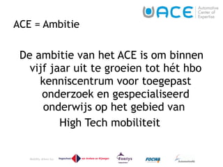 ACE = AmbitieDe ambitie van het ACE is om binnen vijf jaar uit te groeien tot hét hbo kenniscentrum voor toegepast onderzoek en gespecialiseerd onderwijs op het gebied van High Tech mobiliteit