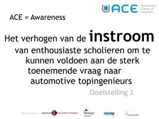 ACE = AwarenessHet verhogen van de instroom van enthousiaste scholieren om te kunnen voldoen aan de sterk toenemende vraag naar automotive topingenieurs Doelstelling 1