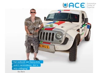 ACE = VehicleEfficiency CO2-uitstoot van voertuigen is één van de grootste oorzaken van de huidige klimaatverandering. Toch wordt verwacht dat de CO2-uitstotende verbrandingsmotor de komende 20 jaar niet zal verdwijnen. Dat vraagt om een aanzienlijke reductie van brandstofconsumptie.