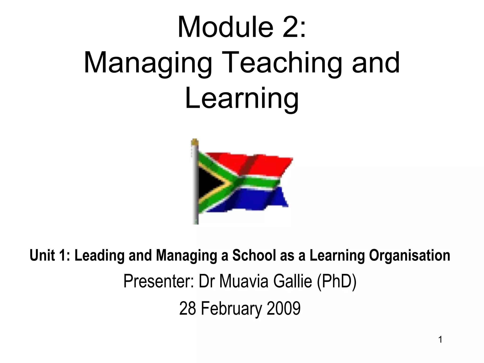 The document provides an overview of a module on managing teaching and learning in schools. It discusses preparing to be a curriculum leader, the context of school leadership, using distributed leadership to improve teaching and learning, establishing a learning culture, developing management plans, and concluding remarks. It also includes details on class activities to define key terms and assess school functionality through a questionnaire and analysis of results.