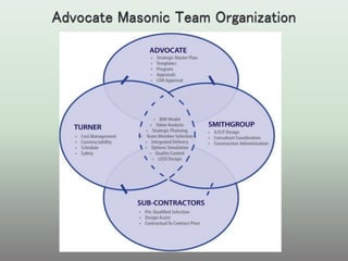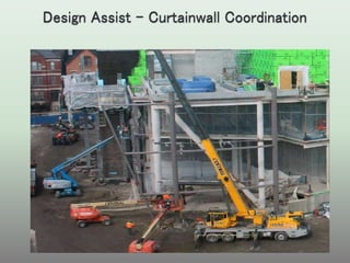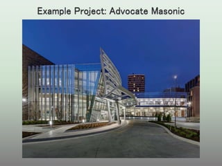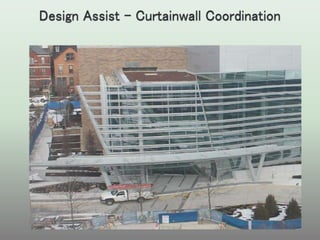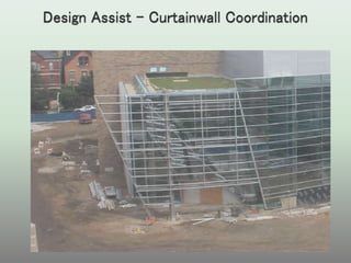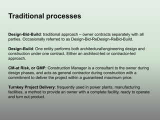 The document discusses various project delivery methods including design-bid-build, design-build, and integrated project delivery (IPD). It highlights the differences between traditional approaches, which rely on linear and fragmented processes, and IPD, which encourages collaboration among all stakeholders from the outset. The document emphasizes the benefits of an integrated approach in terms of productivity, cost savings, and enhanced project outcomes through shared knowledge and technology.