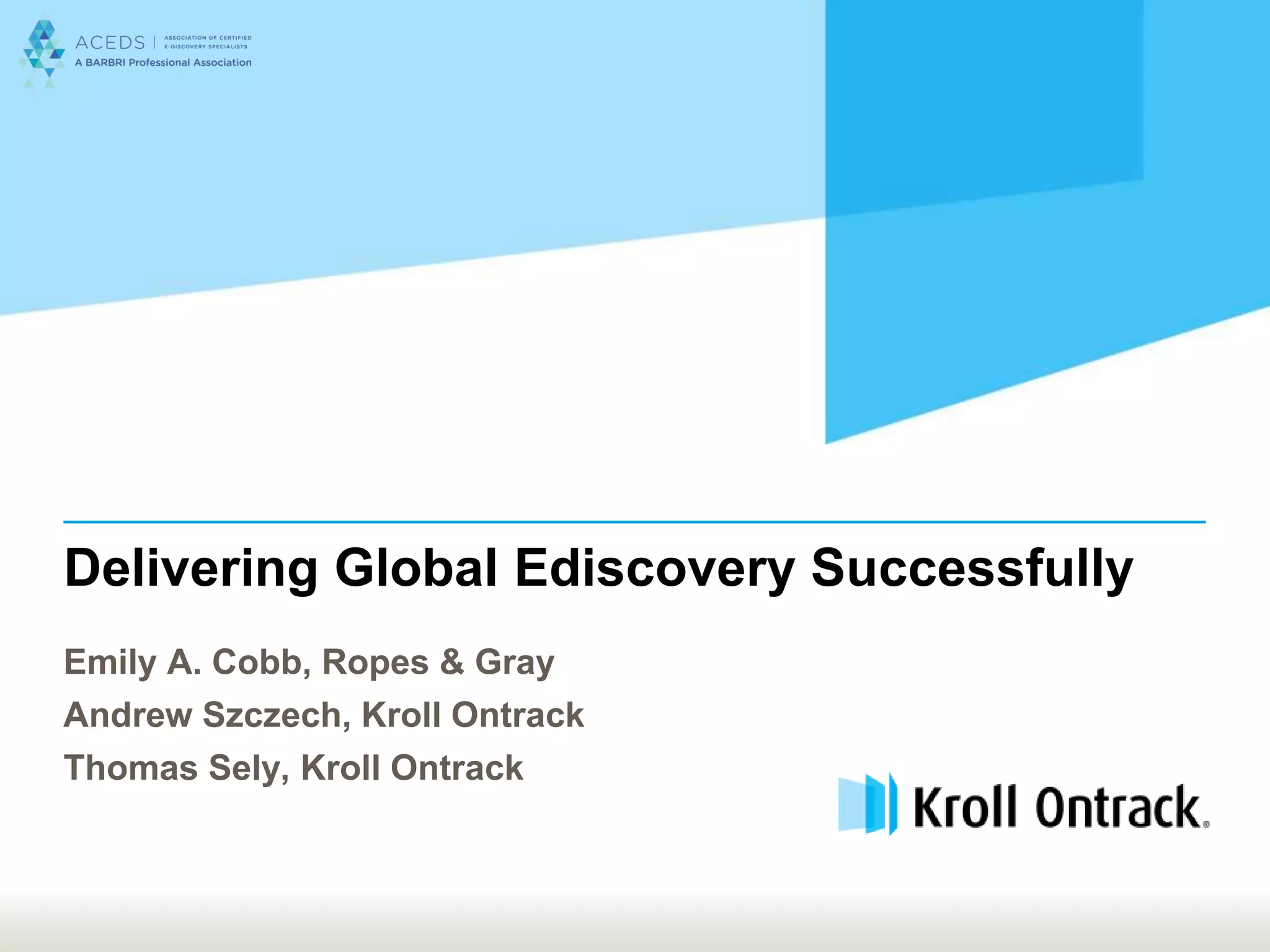 The document discusses delivering electronic discovery globally. It begins with introductions of the presenters, Emily Cobb from Ropes & Gray, Andrew Szczech from Kroll Ontrack, and Thomas Sely from Kroll Ontrack. The webinar then covers legal frameworks for eDiscovery across jurisdictions, cultural considerations regarding privacy, and practical experiences in collecting data from different countries and complying with varying privacy laws.