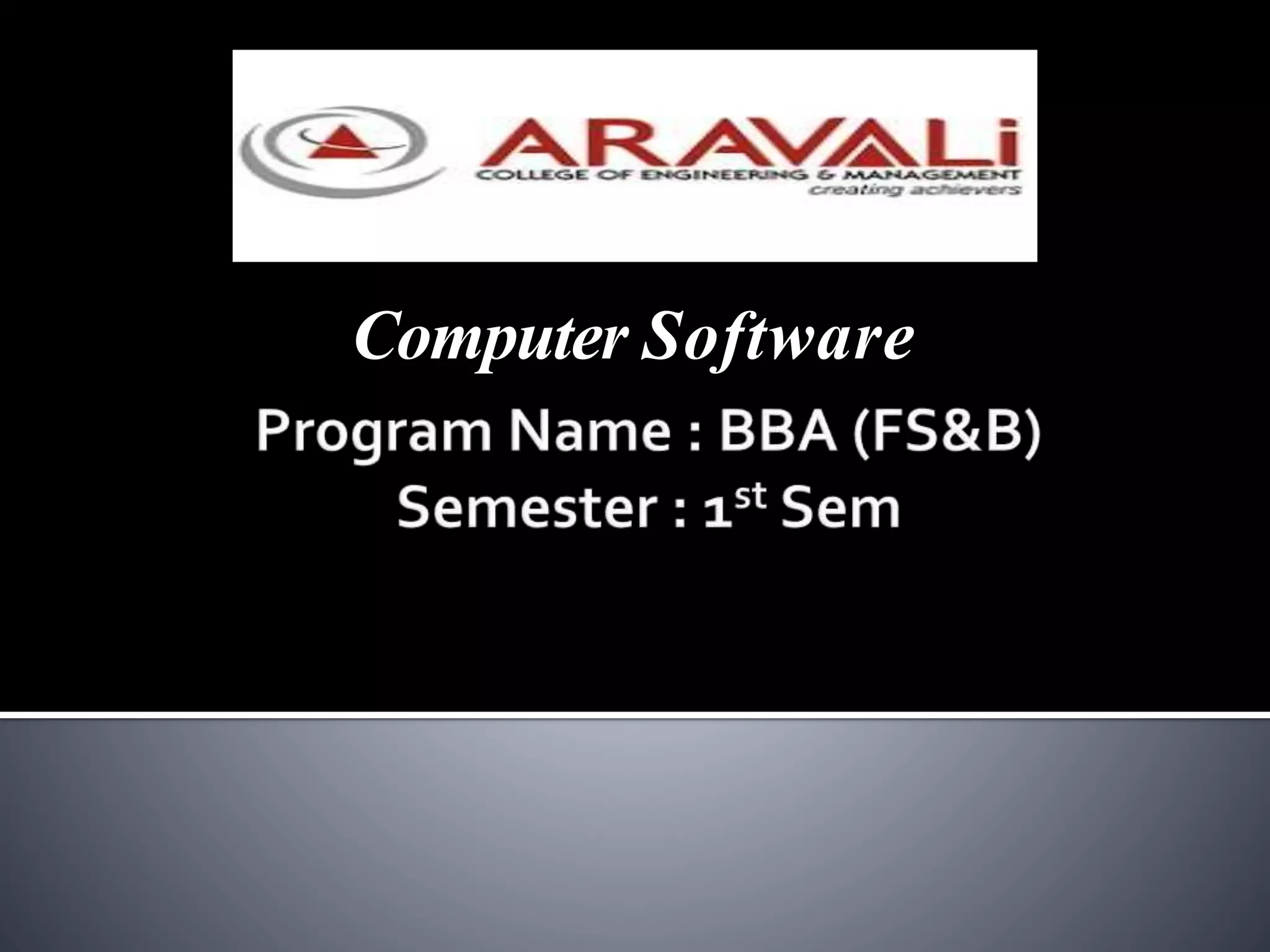 Computer software includes system software and application software. System software consists of operating systems and utilities that control hardware and enable applications to run. Application software includes programs that perform tasks for users like word processors, spreadsheets, and databases. Software can be proprietary, in-house, off-the-shelf, customized, or open source and is typically stored on a computer's hard disk or removable media.