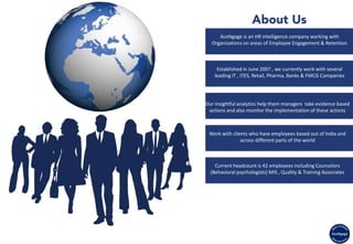 Acengage is an HR intelligence company established in 2007 that specializes in employee engagement and retention, working with various industries including IT, retail, and healthcare. They provide comprehensive services such as predictive attrition models and onboarding support, utilizing analytics to improve retention rates and address employee dissatisfaction. With a focus on unbiased feedback, Acengage conducts exit interviews and surveys to identify key issues surrounding attrition and employee engagement, allowing organizations to refine their HR practices.
