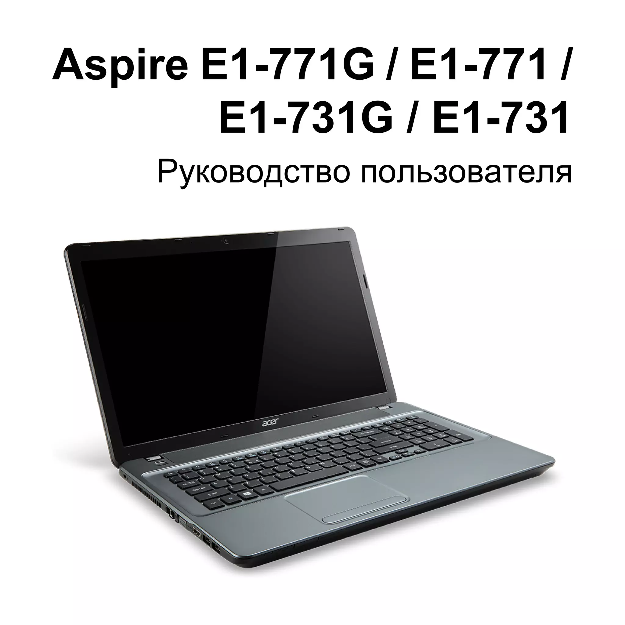 Руководство пользователя для моделей Acer Aspire E1-771G, E1-771, E1-731G и E1-731 содержит информацию о подключении, уходе за устройством, функциях и настройках безопасности. Оно охватывает темы, от включения компьютера до управления питанием и восстановления системы, а также содержит советы по безопасному использованию аккумуляторов и об общих мерах предосторожности. Документ также включает разделы по устранению неисправностей и поддержке пользователей.