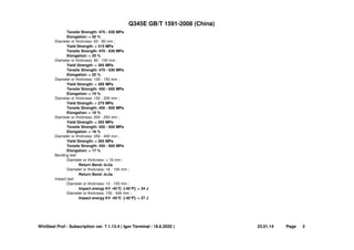 This document outlines the chemical composition, mechanical properties, and testing requirements for Q345E high strength low alloy structural steel according to the Chinese standard GB/T 1591-2008. The standard specifies allowable ranges for chemical elements like carbon, manganese, phosphorus, and sulfur. It also provides minimum yield strength, tensile strength, and elongation requirements that vary based on the diameter or thickness of the steel piece. Additional specifications are given for bending tests and impact tests at low temperatures.