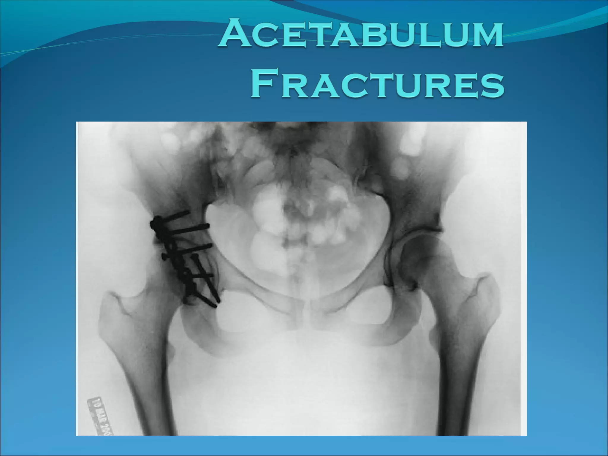 The document discusses the anatomy and classification of acetabular fractures. It notes that Judet and Letournel analyzed the anatomy of the innominate bone and established planes and angles. Acetabular fractures are classified using the Judet and Letournel or Orthopaedic Trauma Association systems. Treatment may involve non-operative management with traction or surgery depending on the fracture pattern and stability. Surgical approaches are dependent on the specific fracture location and goal is anatomic reduction to restore a congruent joint. Complications can include arthritis, heterotopic ossification, nerve injuries and infection.