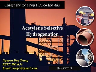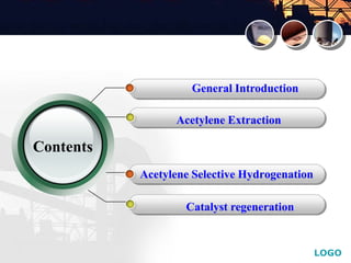 This document provides an overview of acetylene selective hydrogenation processes. It discusses how acetylene is extracted from hydrocarbon streams using solvent absorption or selective hydrogenation. The two main types of selective hydrogenation are front-end, which treats lighter feedstocks before fractionation, and tail-end, which treats C2 fractions after removal of lighter components. Tail-end hydrogenation is more common and uses palladium-based catalysts with high selectivity for acetylene. The document also reviews catalyst regeneration methods used to remove coke and restore activity.