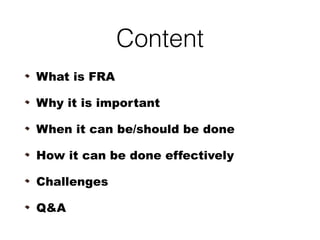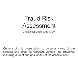 The presentation discusses Fraud Risk Assessment (FRA) as a tool for preventing and detecting fraud by identifying risks and evaluating existing control measures. It outlines when and how to conduct an FRA, including planning, data analytics, and reporting, while highlighting challenges such as resource limitations and the inherent nature of risks. The speaker emphasizes the importance of collaboration with stakeholders and maintaining a proactive approach to fraud risk management.