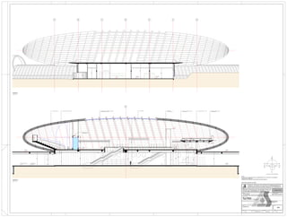 The document appears to be a floor plan with various rooms and sections labeled with letters A through G. It includes dimensions and technical specifications for various building materials like the FORRO PAINEL IDEACUSTIC soundproofing panels, VIDRO LAMINADO laminated glass, and ELEVADOR PNE pneumatic elevator. The diagram also specifies colors like the COR VERMELHO red color reference RAL 3020.
