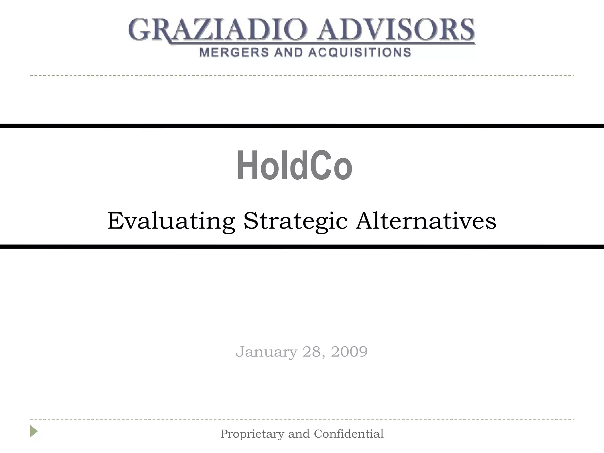 The document evaluates strategic alternatives for holdco, focusing on an acquisition of fashionco for $85 million to enhance growth and achieve cost synergies. It discusses various options including mergers and divestitures, with a recommendation to merge apparelco with fashionco to meet financial targets and streamline operations. Valuations indicate holdco's growth objectives can be met through this acquisition, despite challenges in the publishing and apparel industries.