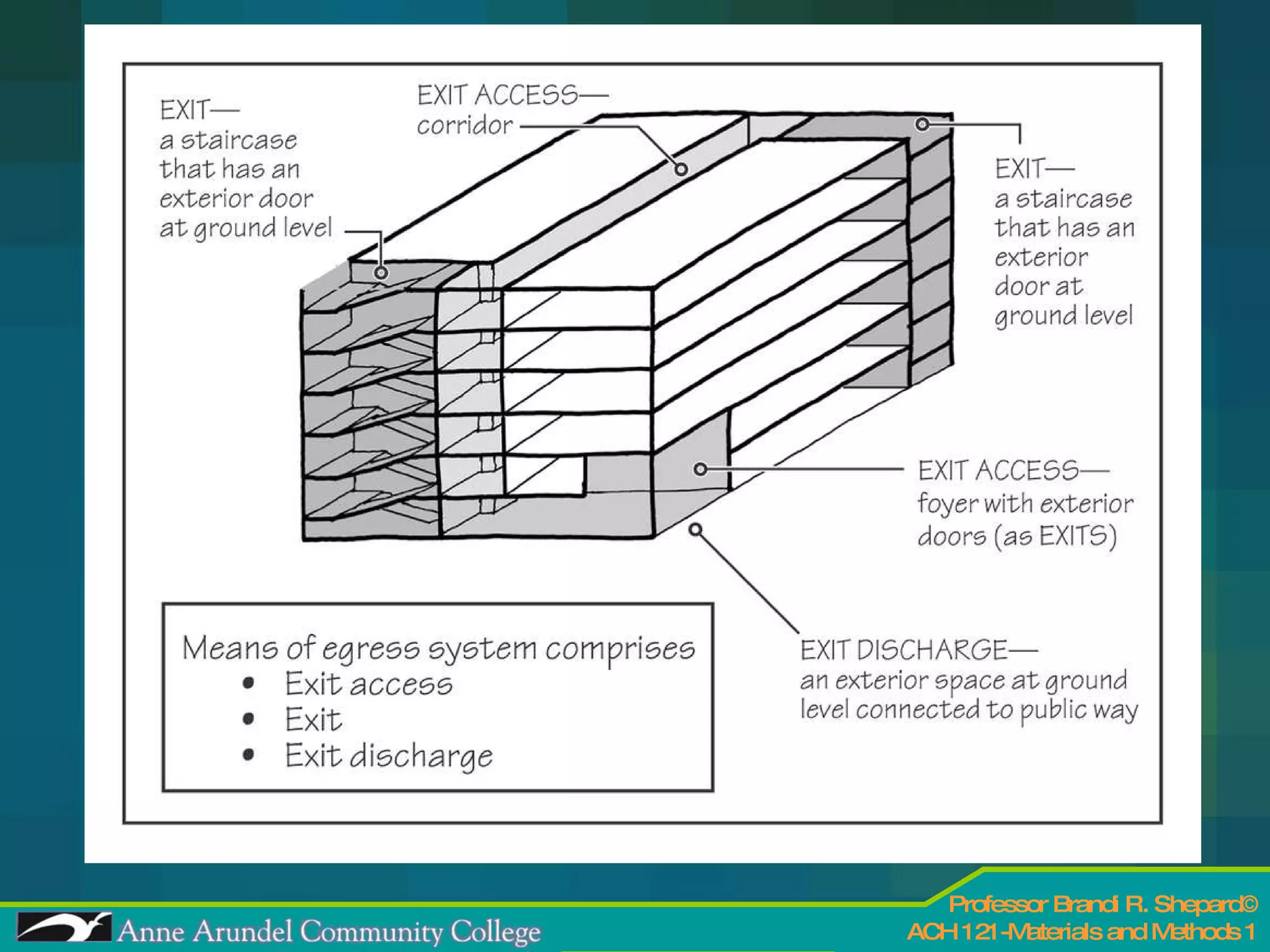 Life Safety &Building Code Issues Means of Egress Methods of exiting the building in the event of an emergency Exit Access (corridors/hallways, stairs) Exit (exterior doors, windows) Exit Discharge (exterior space connected to public right of way) Points of Refuge (safe places for people to go away from bldg) Occupancy Loads More people may require more exits and fire protection. Hourly Ratings The minimum amount of time an object or construction assembly must last until the fire burns through.