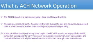 The ACH network is an electronic payment system that enables batch processing of transactions between financial institutions, providing faster processing than traditional checks. It comprises participants like originators and banks, facilitating both debit and credit transactions for various use cases including bill payments and payroll. Utilizing ACH allows for timely payments, reduced processing costs, and improved payment tracking without the need for physical checks.