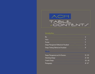 The document provides a professional portfolio for Amanda C. Hill that summarizes her experience and qualifications in design management, art direction, advertising, graphic design, and photography. It includes sections on her bio, vision, process, definitions of design management and thinking, and examples of her work in various design fields. The portfolio is intended to showcase Hill's strategic and creative skills across multiple design disciplines.