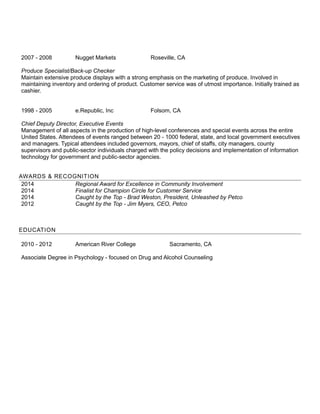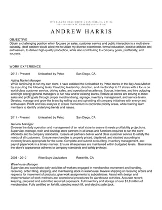 Andrew Harris seeks a challenging position focusing on sales, customer service, and public interaction. He has over 15 years of experience in retail management, including currently serving as Acting Market Manager for 11 Unleashed by Petco stores. Prior to that, he was General Manager of a Unleashed by Petco store and held warehouse and produce specialist roles. He has an Associate Degree in Psychology from American River College.
