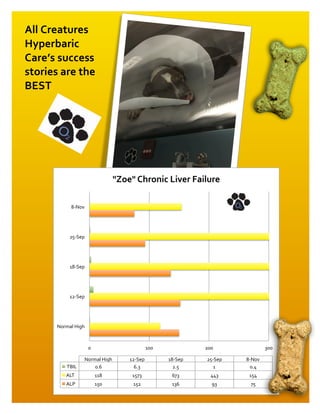 The document discusses various medical measurements and dates relevant to a patient named Zoe suffering from chronic liver failure. It highlights the success stories of hyperbaric care in treating various conditions. Additionally, it provides some statistical data related to treatments.