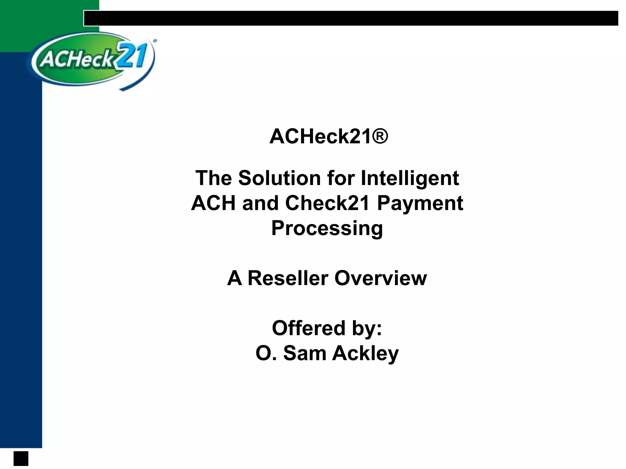 ACHeck21 is a solution for intelligent ACH and Check21 payment processing that offers deployment options including check imagers, credit card terminals, and document imagers from various manufacturers. It provides an intelligent routing gateway and allows users to easily manage risk and reporting for all transaction types. Resellers are also able to collect fees and be paid for their services through the ACHeck21 platform.