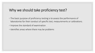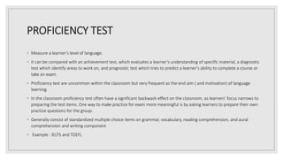 Proficiency tests measure a learner's overall language ability and can be compared to other types of language assessments. Proficiency tests are commonly used as end goals for language learning but are less frequent in classroom settings, where they can narrow student focus only to test preparation. Proficiency tests generally consist of standardized multiple choice sections covering grammar, vocabulary, reading, listening, and writing. Examples of proficiency tests include the IELTS and TOEFL.