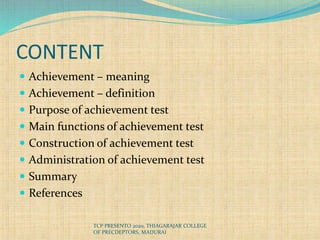 The document discusses achievement tests, including their purpose and how they are constructed and administered. It defines achievement tests as measures of learning attainments after a period of instruction. The key purposes of achievement tests are to assess competence, diagnose strengths and weaknesses, and inform instruction. Achievement tests are constructed following steps like planning, developing a blueprint to guide item writing, creating a scoring scheme, and editing the final test. Proper administration of achievement tests creates an environment where students can demonstrate their knowledge.
