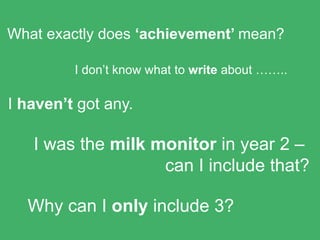 This document provides guidance on including achievements in a CV. It recommends listing 3 key achievements that demonstrate what you value and have accomplished. Achievements can be from academic or extracurricular pursuits, and should be successes you are proud of. Examples of student achievements include participating in charitable fundraising, earning academic honors, and taking on leadership roles in school activities. The document advises selecting recent achievements from the last 2 years and providing enough detail for readers unfamiliar with the activities to understand your successes.