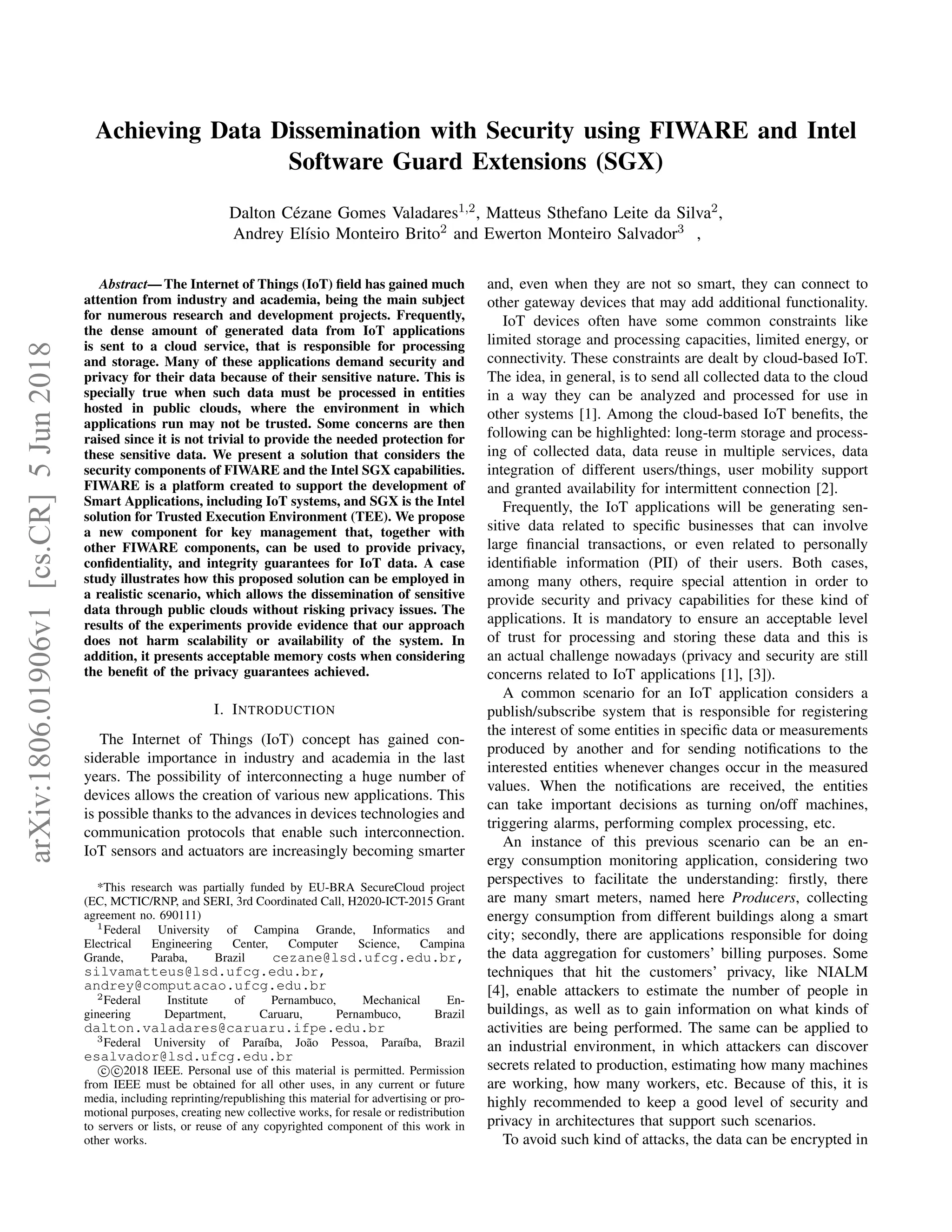 This document proposes and evaluates a solution to securely disseminate sensitive IoT data using FIWARE and Intel SGX. The solution uses FIWARE components for authentication and authorization, and introduces a new Key Vault component that uses Intel SGX to securely store and manage encryption keys. Sensitive IoT data from smart meters is encrypted before being sent to the FIWARE Orion Context Broker for processing. Consumers that are SGX applications can decrypt and process the data securely within the SGX enclave. The evaluation shows the solution provides privacy and security guarantees without harming scalability or availability.