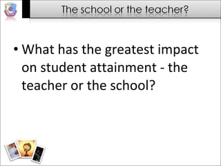 The document discusses the critical role of teachers in student achievement, emphasizing that effective teaching methods significantly impact exam success more than school resources or management systems. It advocates for the '20-80 rule,' where focusing on key effective teaching strategies can yield substantial improvements in student performance. Strategies suggested include interactive teaching, thorough exam preparation, and fostering independent learning, stressing the importance of teachers understanding curriculum demands and employing effective assessment techniques.