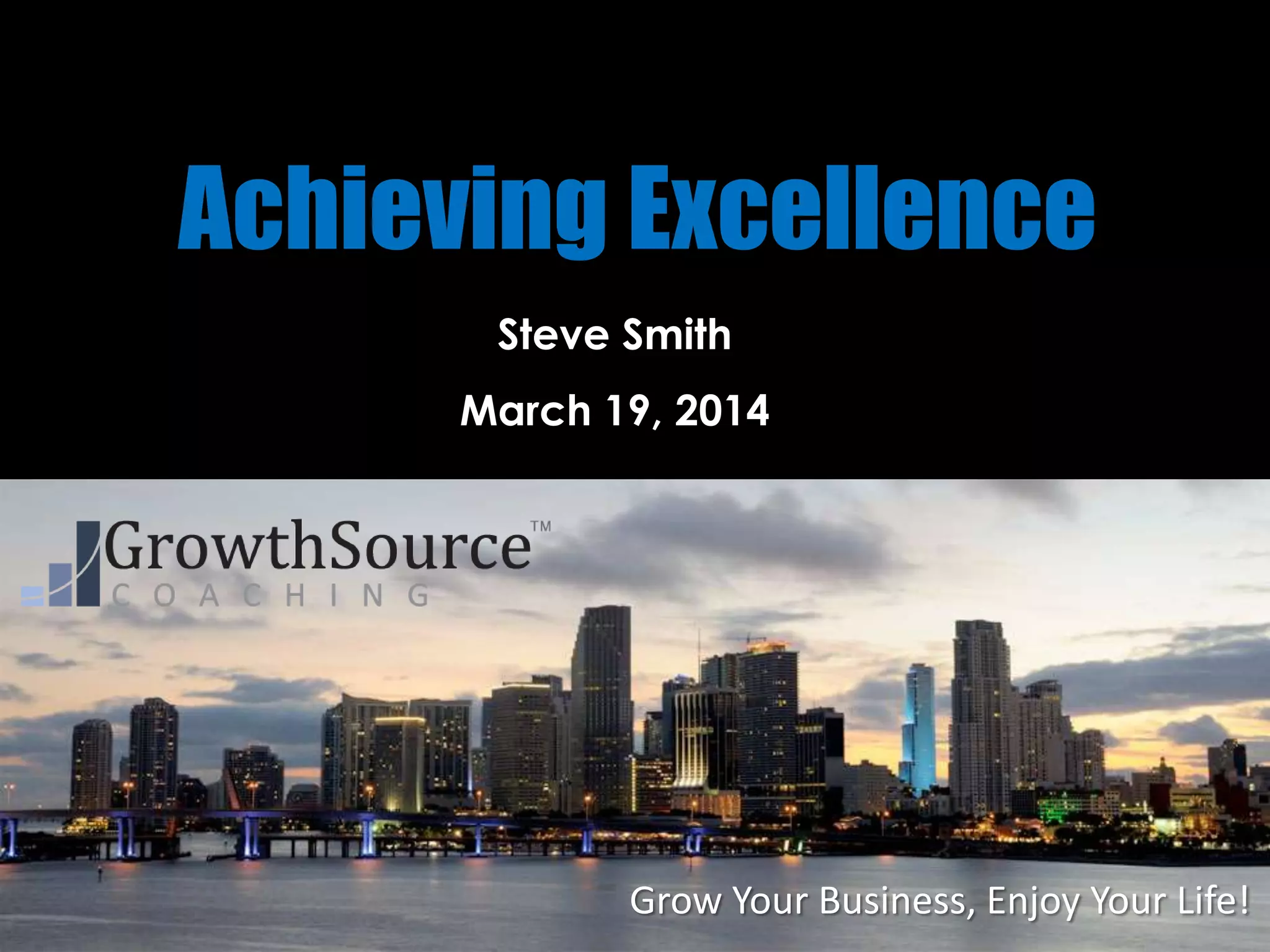 This document outlines 10 principles for achieving excellence in business and life. The principles include doing what you love, being clear on what you want to be known for, embracing excellence in all that you do through practice and rituals, being committed to continuous self-improvement, setting goals and plans, being willing to work hard, seeking feedback, creating an inspiration strategy with mentors, being a lifelong student, and seizing opportunities. Achieving excellence requires an ongoing commitment to bettering oneself through passion, focus, hard work, learning, and adapting to maximize potential.