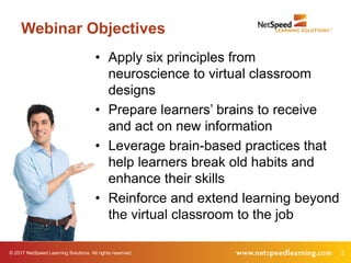 The document discusses applying brain-based principles to virtual classroom design to maximize learning retention. It covers 6 principles: priming the pump to prepare learners, chunking content, mixing up activities and spacing practice, allowing learners to sleep on content, testing and retesting, and having learners apply content. The document includes quizzes, polls, and examples for applying each principle and emphasizes designing virtual programs and training facilitators to leverage neuroscience findings.