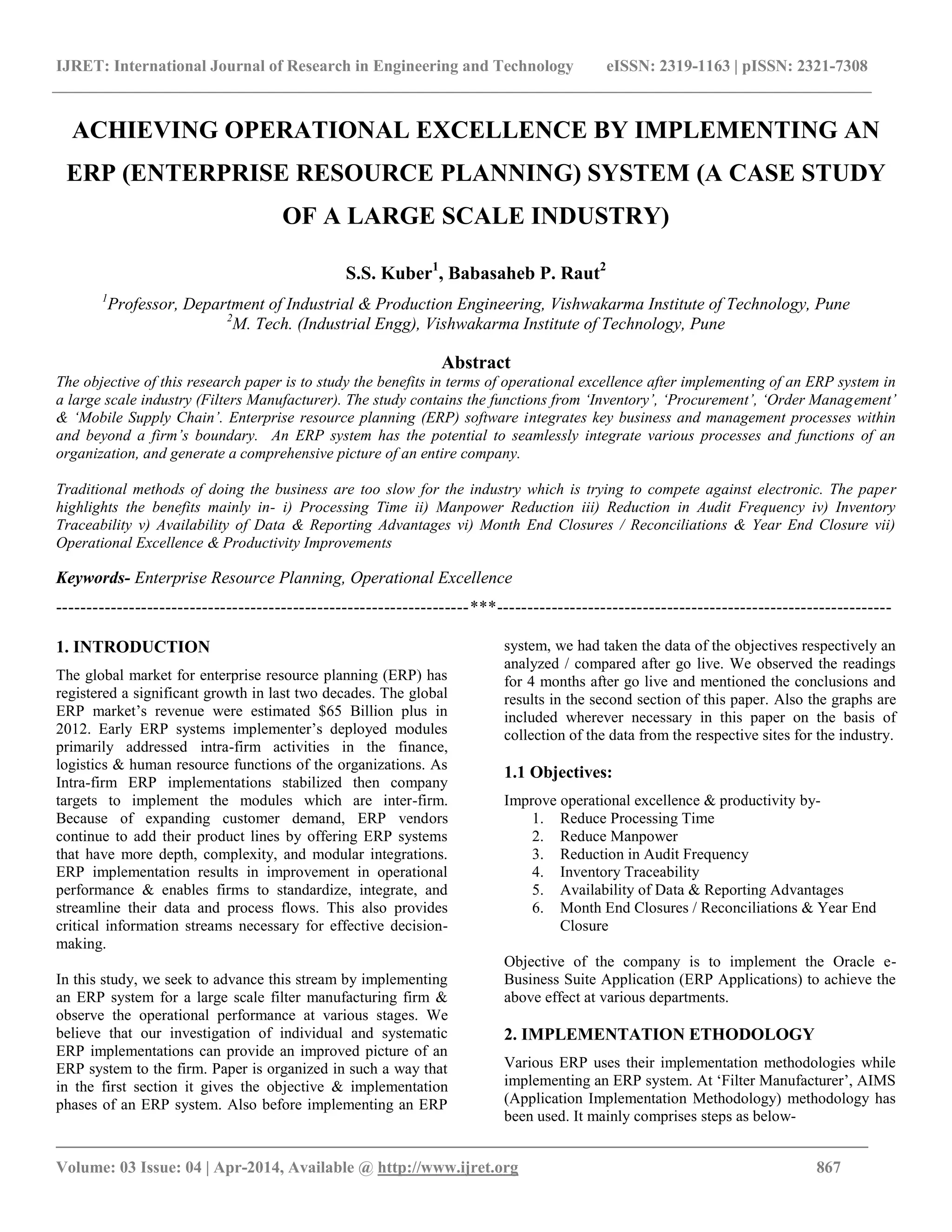 This research paper investigates the operational excellence achieved through the implementation of an ERP system at a large-scale filter manufacturing company. The study highlights various benefits such as reduced processing time, manpower, audit frequency, and improved inventory traceability and reporting advantages. The paper also discusses the methodologies and objectives behind the ERP implementation process, focusing on enhancing productivity and integrating business functions effectively.