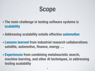 This document discusses challenges in testing advanced driver assistance systems (ADAS) and approaches to address scalability. It describes using physics-based simulation and search-based testing to generate test cases for an automated emergency braking system. The testing faces challenges due to the large, complex input space and computational expense of simulations. Decision trees are proposed to better guide the search by partitioning the input space into homogeneous regions based on criticality.