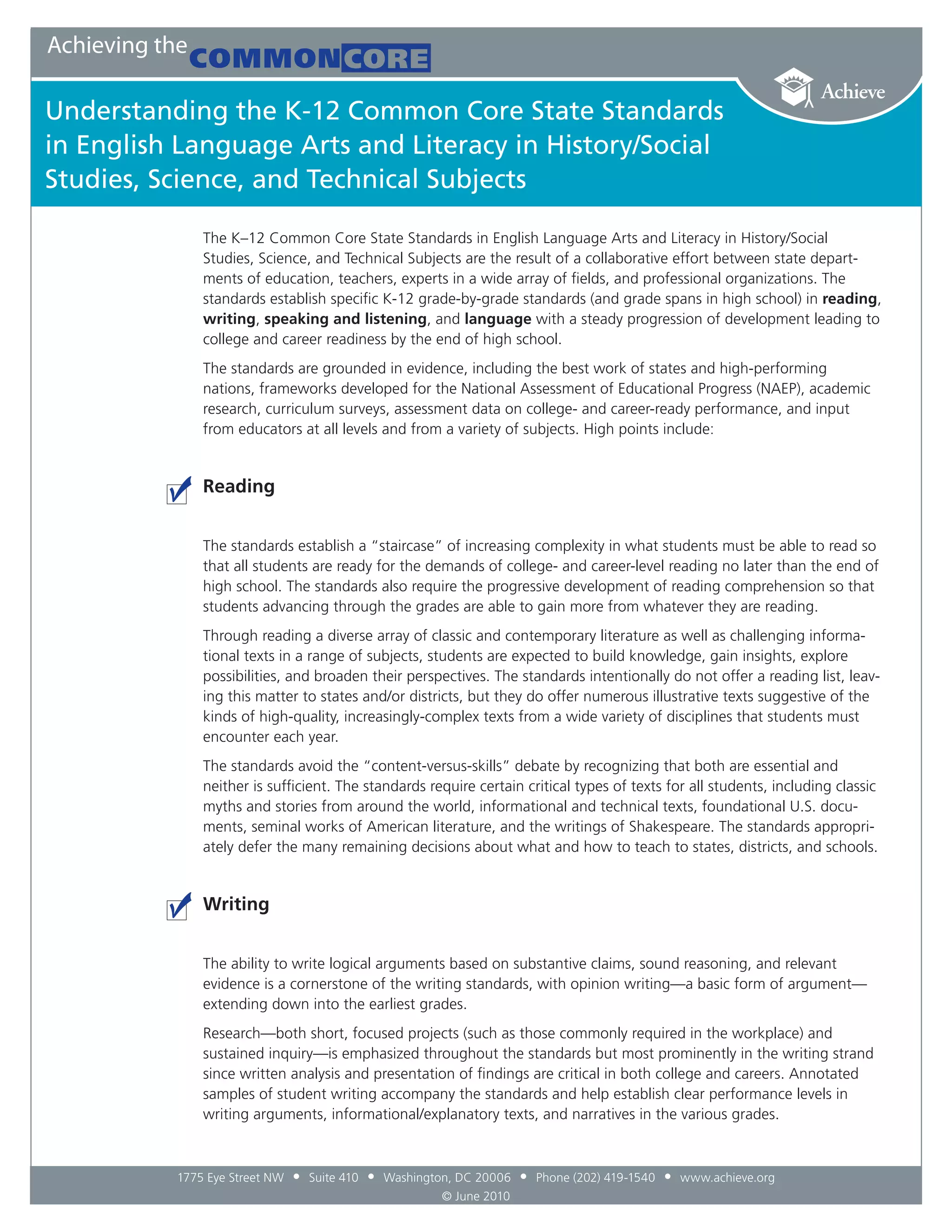 The document summarizes the key aspects of the Common Core State Standards in English Language Arts and Literacy. The standards were developed through a collaborative process and establish clear benchmarks for reading, writing, speaking, listening and language skills at each grade level to ensure students are prepared for college and careers. The standards emphasize progressive development of reading comprehension skills, argument-based writing, research skills, and the ability to present information orally. Vocabulary, grammar and conventions are also addressed.