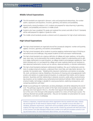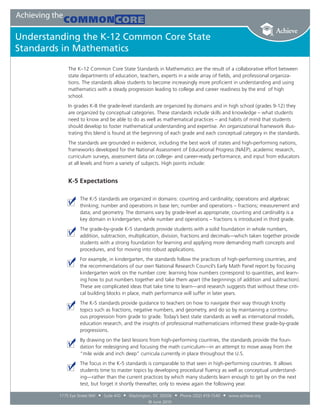 The document summarizes the key aspects and expectations of the K-12 Common Core State Standards in Mathematics. It describes how the standards are organized by domain and conceptual category at different grade levels. The standards aim to ensure students gain a solid foundation in foundational math concepts in elementary school and are prepared for more advanced topics like algebra and statistics by middle and high school. The goals are for students to develop both procedural fluency and conceptual understanding in math.