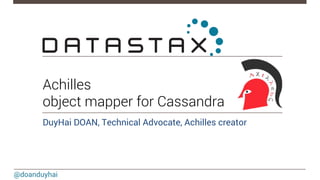 This document discusses Achilles, an object mapper for Cassandra. It provides a live demo of Achilles' main API for insert, update, remove, and find operations. The document also outlines Achilles' documentation, slice and typed queries, native queries, options, and roadmap including asynchronous support and integration with Elasticsearch.