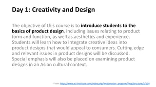 The objective of this course is to introduce students to the basics of product design, including issues relating to product form and function, aesthetics, and consumer experience. Students will learn how to integrate creative ideas into appealing product designs for consumers. Current issues and cutting-edge topics in product design will be discussed, with special emphasis placed on examining designs within an Asian cultural context.