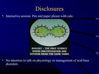 - Examples of ABG reports are given along with analyzing what abnormalities are present and what actions should be taken, such as adjusting ventilator settings or oxygen levels. The importance of clinical context is also stressed.