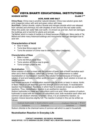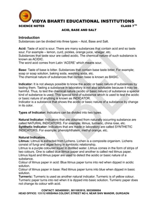 This document discusses acids, bases, and indicators. It defines acids as sour substances and bases as bitter substances. It explains that litmus paper and other natural indicators like turmeric can be used to test whether a substance is acidic or basic by changing color in acid or base. Neutralization occurs when an acid and base are mixed, forming a salt and neutral solution. Examples of neutralization in everyday life include treating indigestion with antacids, reducing bee stings with baking soda, adjusting soil pH, and treating factory waste before disposal.