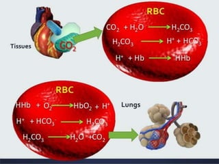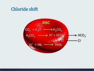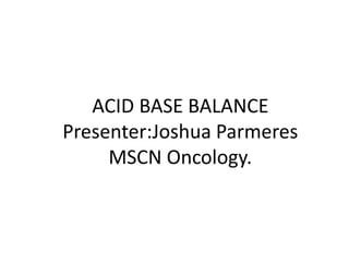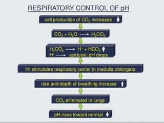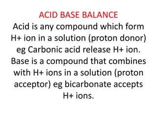 The document discusses acid-base balance and the mechanisms that regulate pH levels in the human body. There are three primary systems that regulate hydrogen ion levels to maintain blood pH between 7.35-7.45: 1) the buffer system acts rapidly to prevent excessive changes in pH by combining with acids or bases, 2) the respiratory system regulates carbon dioxide levels in the blood through breathing, and 3) the renal system permanently eliminates hydrogen ions through urine and maintains bicarbonate levels. Disruptions to acid-base balance can cause conditions like acidosis or alkalosis with neurological symptoms and the body aims to compensate for underlying issues.