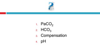 The document discusses acid-base balance and acid-base disorders. It describes three main systems that help maintain pH balance - buffers, the respiratory system, and the renal system. It explains how to interpret arterial blood gases by evaluating the pH, pCO2, HCO3, and other values to determine if a patient has respiratory or metabolic acidosis or alkalosis. Compensation by other systems is discussed when one system is imbalanced. Interpreting values and identifying primary vs compensated disorders is key to proper nursing care.