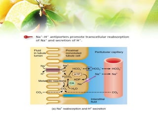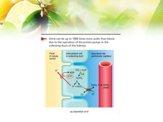 The document discusses the regulation of acid-base balance in the kidneys, highlighting how metabolic processes produce acids that are excreted as hydrogen ions in urine. It explains metabolic acidosis and alkalosis, including their causes and treatments, and emphasizes the importance of urine acidification for preventing renal stones and promoting antibacterial action. Key mechanisms and conditions affecting bicarbonate levels and pH regulation in the body are detailed.