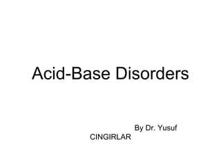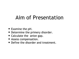 This document discusses acid-base disorders. It begins by outlining the aims of examining pH, determining the primary disorder, calculating the anion gap, assessing compensation, and defining the disorder and treatment. It then provides introductions to pH, the Henderson-Hasselbalch equation, arterial blood gas analyses, and the anion gap. The document proceeds to discuss types of acid-base disorders including metabolic acidosis, respiratory acidosis, metabolic alkalosis, and respiratory alkalosis. It covers causes, symptoms, and treatments for each. An example case is presented of a patient with respiratory alkalosis.