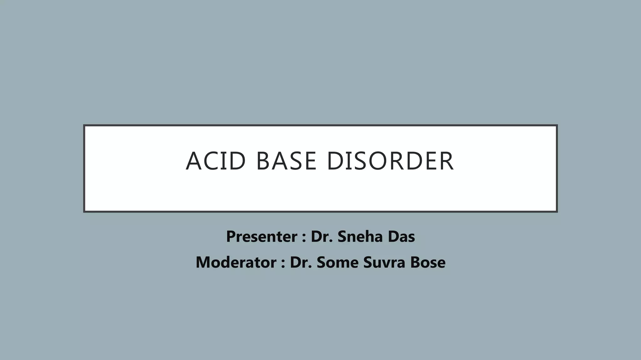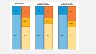 This document discusses acid-base disorders. It begins by explaining that the human body maintains a slightly basic pH through various buffering mechanisms. It then describes the bicarbonate buffer system and how the lungs, kidneys, and buffers work to regulate pH. It discusses the causes, classifications, and clinical features of metabolic acidosis and alkalosis. Key points include how to interpret arterial blood gases, calculate anion and urine gaps, and determine compensations and mixed disorders. The document provides an in-depth overview of acid-base physiology and pathophysiology.