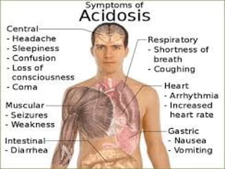 This document discusses acid-base balance and imbalance. It defines key terms like pH, acids, and bases. The body regulates acid-base balance through buffering systems, respiratory compensation, and renal compensation. Acid-base imbalance can be diagnosed using arterial blood gases and anion gap tests. The main types of imbalance are respiratory acidosis and alkalosis from lung issues, and metabolic acidosis and alkalosis from kidney or production problems. Causes, signs, and compensation methods are described for each type.
