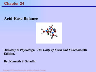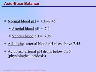 The document discusses acid-base balance and regulation in the human body. It defines normal blood pH as 7.35-7.45 and describes how the respiratory and renal systems work to regulate pH levels and compensate for acidosis or alkalosis. The respiratory system regulates pH by increasing or decreasing respiration to eliminate or retain carbon dioxide, while the renal system regulates pH by reabsorbing or secreting bicarbonate and hydrogen ions to compensate for acid-base imbalances.