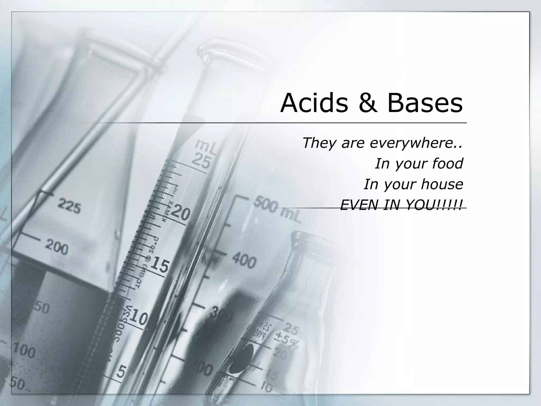 This document discusses acids and bases. It defines acids as solutions with excess H+ ions that have sour tastes and corrode substances, while bases have excess OH- ions, feel slippery, and taste bitter. Common acids include acetic acid in vinegar and citric acid in fruits, while bases are found in soaps, cleaners, and blood. The pH scale measures acidity and basicity from 0-14, with acids below 7 and bases above. Acid-base reactions involve neutralization.
