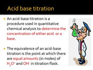 An acid-base titration is used to determine the concentration of an acid or base. The equivalence point is reached when there are equal moles of H3O+ and OH- ions, resulting in a neutral pH of 7. The indicator changes color sharply at the equivalence point, showing the reaction is complete. Different types of acid-base reactions result in different pH values at the equivalence point, determined by whether the acid and base are strong or weak.