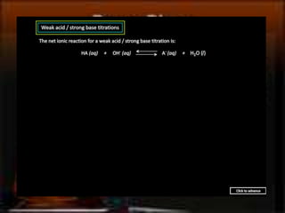 This document discusses acid-base titration, including definitions of acids and bases, strong vs weak acids and bases, and the technique of titration. It explains that a titration reaches the equivalence point when the moles of acid equals the moles of base, producing a neutral solution. This can be shown using the equation MAVA = MBVB, where M is molarity, V is volume, and A and B indicate acid and base. An example titration calculation is provided.