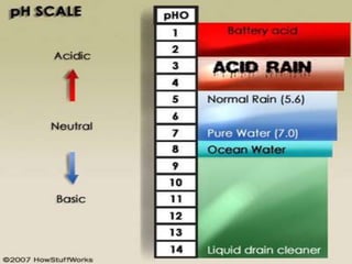 The document provides an overview of acid rain, discussing its formation from the combination of rainwater, carbon dioxide, and various gaseous pollutants like sulfur and nitrogen oxides. It outlines the effects of acid rain on buildings, plants, soils, water bodies, and human health, highlighting the damaging impact on ecosystems and architecture. Solutions to combat acid rain include reducing fossil fuel use and transitioning to alternative energy sources.