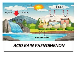 This document summarizes the key points about acid rain. It defines acid rain as rain containing nitric acid and sulfuric acid formed when gases like sulfur dioxide and nitrogen dioxide dissolve in water. These gases are released from the combustion of fossil fuels and other industrial processes. Acid rain lowers the pH of lakes and soils, damaging plants and aquatic life. It also corrodes infrastructure and erodes marble structures like the Taj Mahal. The document recommends reducing gas emissions from industries and using pollution control devices to mitigate acid rain.